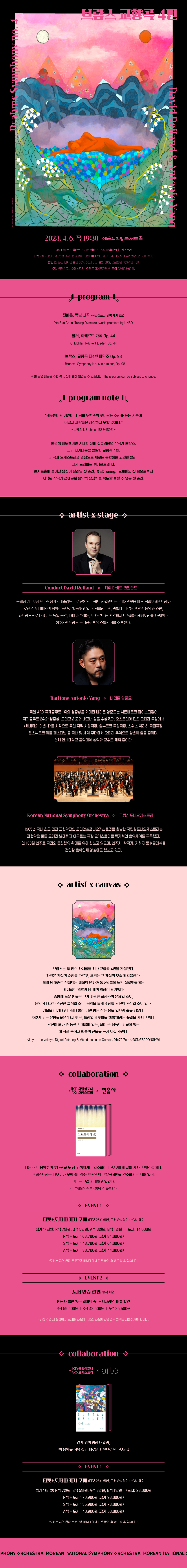 관현악 브람스 교향곡 4번 일자 / 시간 2023-04-06 19:30 장소 예술의전당 콘서트홀 출연 주최/주관 (재)국립심포니오케스트라 관람연령 8세 이상 문의 02-523-6258 티켓가격R석 7만원 / S석 5만원 / A석 3만원 / B석 1만원 예매처 예술의전당 02-580-1300, 인터파크 1544-1555 상세정보 상세정보 목록