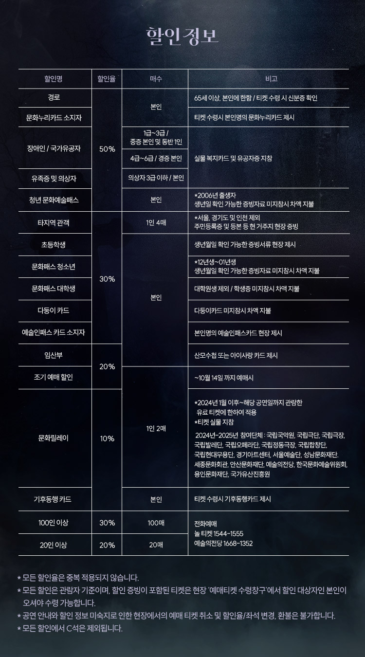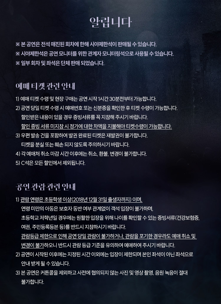 - 티켓가격R석 120,000원 / S석 100,000원 / A석 60,000원 / B석 30,000원 / C석 10,000원
