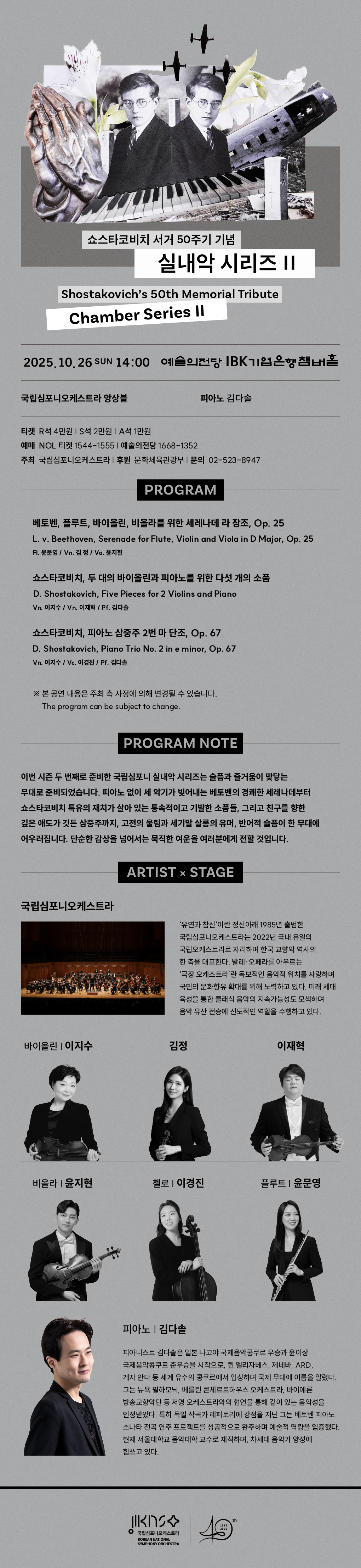 실내악 [기획] 쇼스타코비치 서거 50주기 기념 - 실내악 시리즈 II 일자 / 시간 2025-10-26 14:00 장소 예술의전당 출연 피아노 김다솔 국립심포니오케스트라 단원 주최/주관 국립심포니오케스트라 관람연령 8세 이상 관람 문의 국립심포니오케스트라 02-523-6258 티켓가격R석 4만원 / S석 2만원 / A석 1만원 예매처 예술의전당 1668-1352 / NOL 티켓 1544-1555 예매하기 상세정보 상세정보 목록