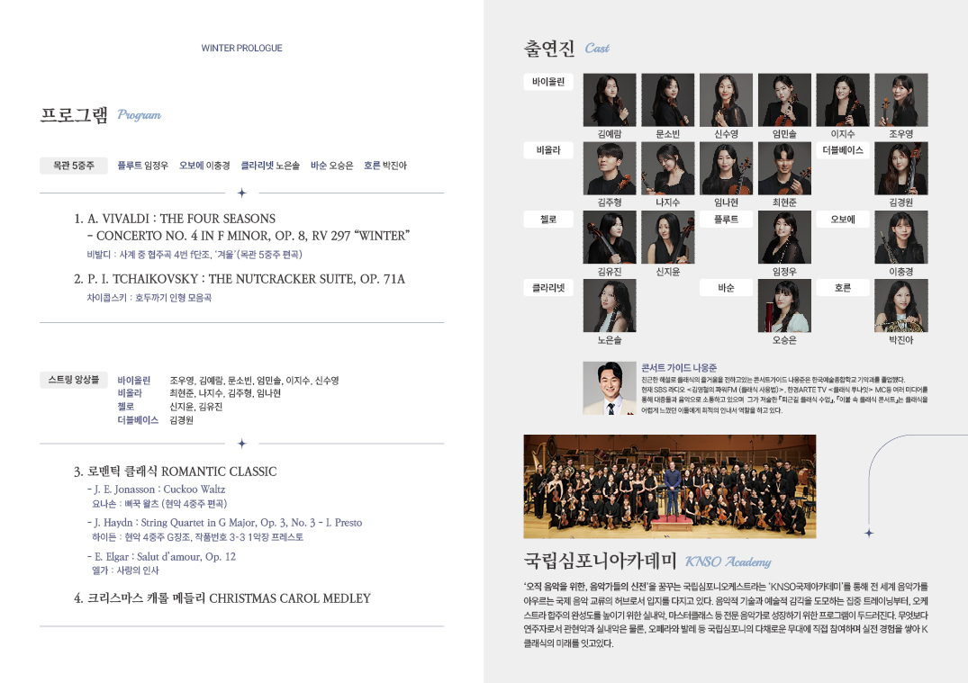 실내악 KNSO아카데미 - 대구 행복북구문화재단 <겨울 프롤로그> 일자 / 시간 2025-12-09 19:30 장소 대구어울아트센터 함지홀 주최/주관 (재)행복북구문화재단 어울아트센터, 국립심포니오케스트라 관람연령 초등학생 이상 관람가 문의 053-320-5120 티켓가격 예매처 www.hbcf.or.kr 예매하기 상세정보 상세정보 ※ 본 공연은'풀 오케스트라' 공연이 아닌 국립 심포니 아카데미 소속 연주자들의목관 5중주 및 13인조 현악 앙상블로 진행되는 실내악 공연입니다. 목록