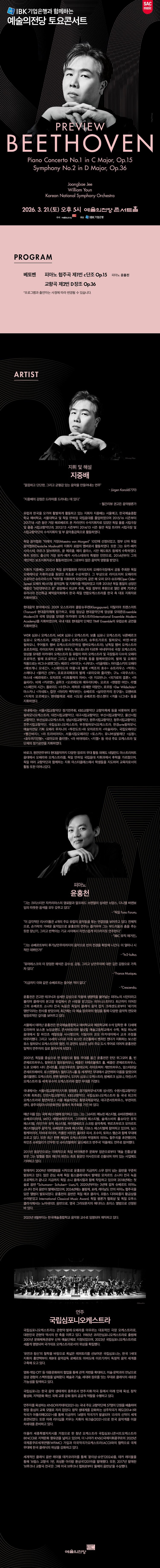 관현악 예술의전당 토요콘서트 - 프리뷰 베토벤 일자 / 시간 2026-03-21 17:00 장소 예술의전당 콘서트홀 출연 지휘 지중배 피아노 윤홍천 주최/주관 예술의전당 관람연령 8세 이상 관람 (2019년생 포함한 이전 출생자) 문의 KNSO 02-523-6258 티켓가격일반석 40,000원 / 3층석 20,000원 예매처 예술의전당 1668-1352 / 인터파크 1544-1555 예매하기 상세정보 상세정보 목록