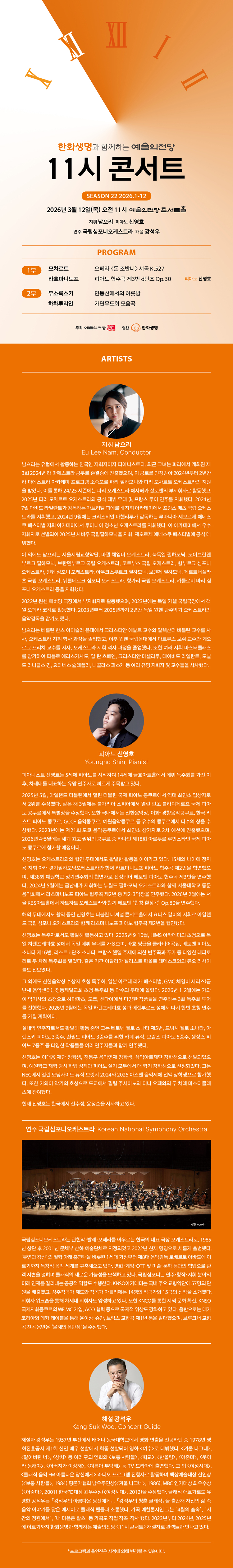 관현악 예술의전당 11시 콘서트 일자 / 시간 2026-03-12 11:00 장소 예술의전당 콘서트홀 주최/주관 예술의전당 관람연령 초등학생이상 문의 예술의전당 1668-1352 티켓가격일반석 30,000원 / 3층석 20,000원 예매처 예술의전당 1668-1352 / 인터파크 1544-1555 예매하기 상세정보 상세정보 목록