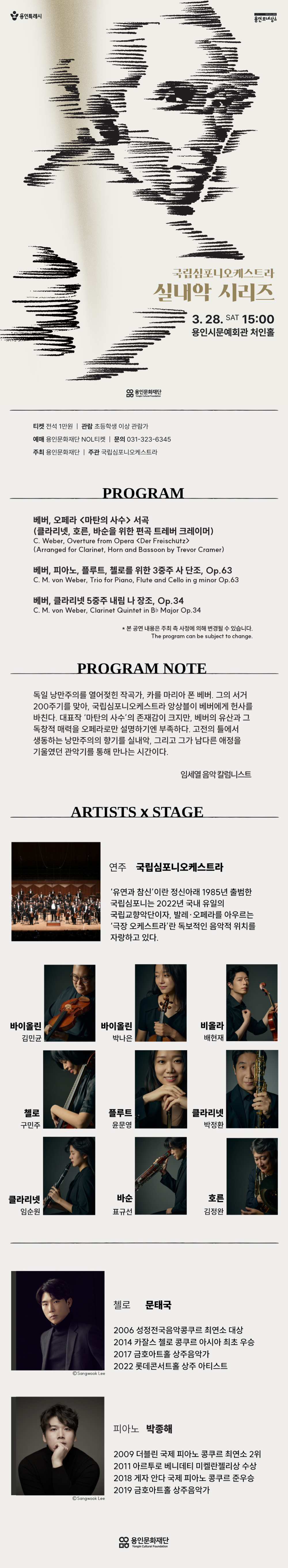 실내악 국립심포니오케스트라 베버 서거 200주기 기념 <실내악 시리즈 I>-용인 일자 / 시간 2026-03-28(토) 15:00 장소 용인시문예회관 처인홀 출연 국립심포니오케스트라 앙상블 주최/주관 (재)국립심포니오케스트라 관람연령 초등학생 이상 문의 용인문화재단 031-260-3300 티켓가격전석 10,000 예매처 용인문화재단 031-260-3300 예매하기 상세정보 상세정보 목록