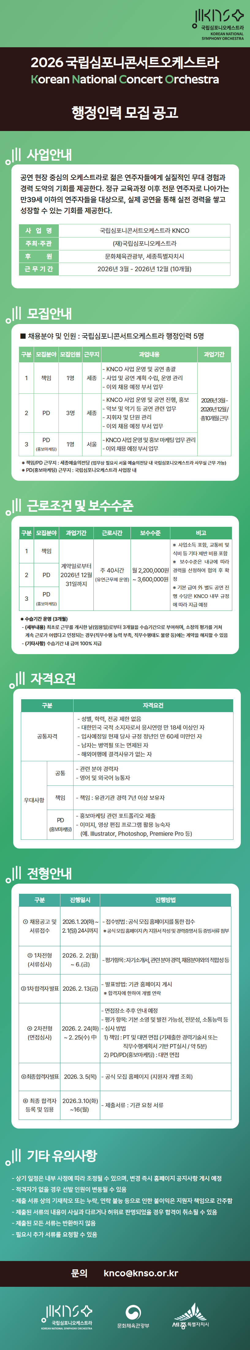 공지사항 작성 운영자2026-01-20 2026 KNCO 국립심포니콘서트오케스트라 - 행정인력 모집 공고 조회240 지원서 접수 (~2/1 24:00까지) ☞ 공식 채용 홈페이지 ☜ 첨부파일 이전 (재)국립심포니오케스트라 2025년 제3차 경력직 직원 채용 최종 합격자 발표 다음 2026 KNCO 국립심포니콘서트오케스트라 - 단원 모집 공고 목록
