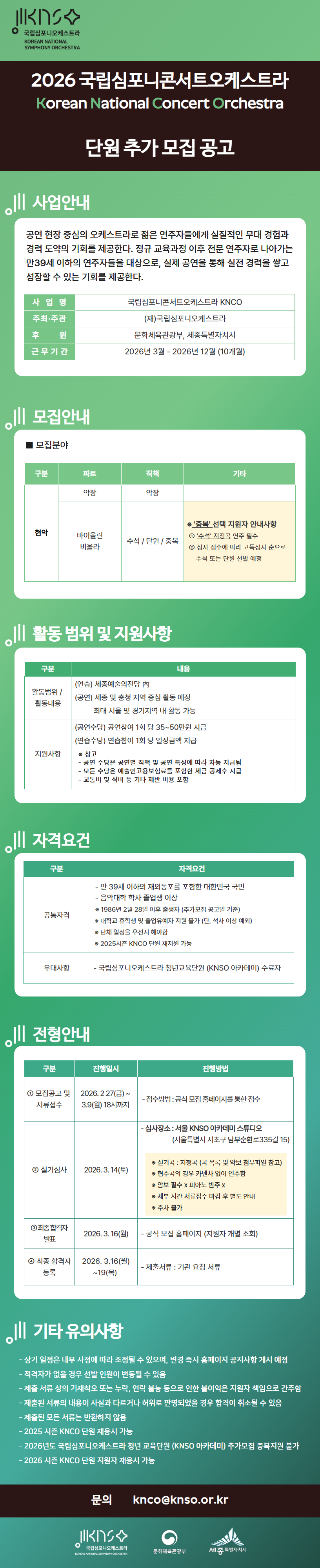 공지사항 작성 운영자2026-02-27 2026 KNCO 국립심포니콘서트오케스트라 - 단원 추가 모집 공고 조회254 지원서 접수 (~3/9 18:00까지) ☞ 공식 채용 홈페이지 첨부파일 2026 KNCO_단원 추가모집(악장, 바이올린, 비올라) 레퍼토리.pdf 다운로드 이전 2026 KNCO 국립심포니콘서트오케스트라 - 단원 및 행정인력 모집 최종 합격자 발표 다음 (재)국립심포니오케스트라 2026년 제1차 경력직 직원 채용 서류접수 현황 발표 목록
