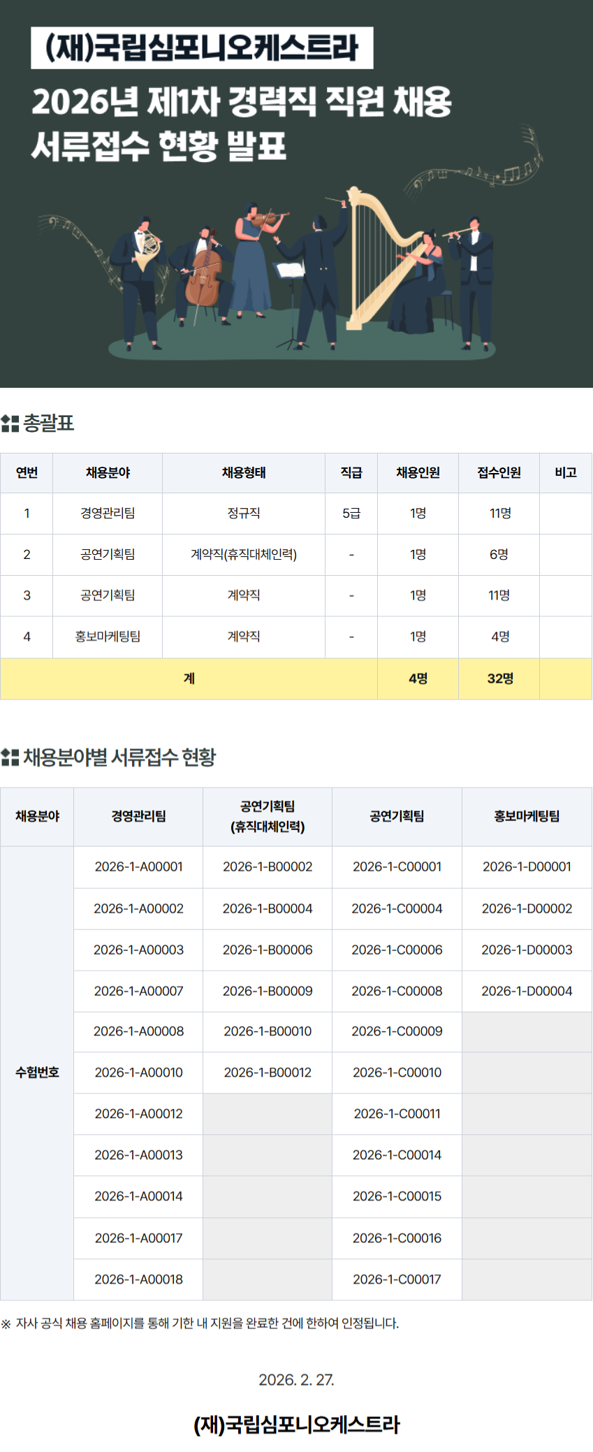 공지사항 작성 운영자2026-02-27 (재)국립심포니오케스트라 2026년 제1차 경력직 직원 채용 서류접수 현황 발표 조회131 첨부파일 이전 2026 KNCO 국립심포니콘서트오케스트라 - 단원 추가 모집 공고 다음 오디션일정 공고 목록