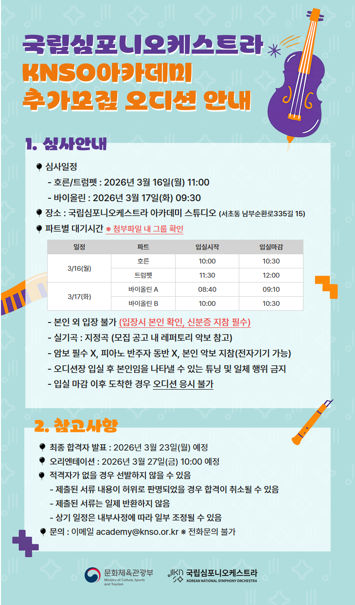 공지사항 작성 운영자2026-03-12 2026 KNSO아카데미(청년 교육단원) 추가 모집 실기심사 안내 조회168 첨부파일 2026 KNSO아카데미(청년 교육단원)_추가모집 오디션 입실 그룹 안내.pdf 다운로드 이전 2026 KNCO 국립심포니콘서트오케스트라 - 단원 추가모집 실기심사 세부 안내 다음 오디션일정 공고 목록