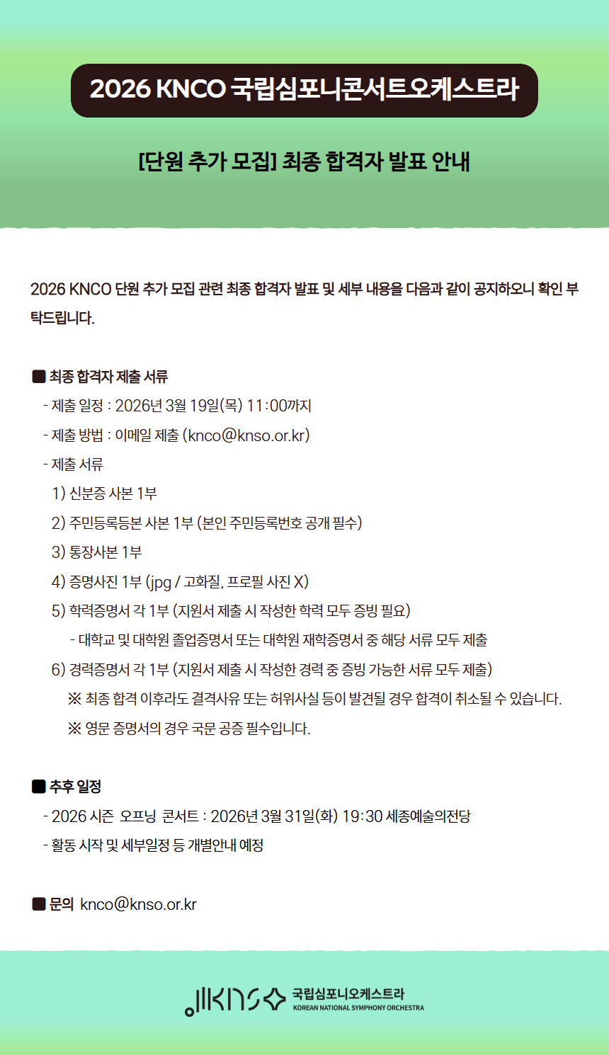 공지사항 작성 운영자2026-03-16 2026 KNCO 국립심포니콘서트오케스트라 - 단원 추가모집 최종 합격자 발표 조회130 최종 합격자 발표 조회 (18:00 ~ 가능 )☞ 공식 채용 홈페이지 ☜ 첨부파일 이전 2026 KNSO아카데미(청년 교육단원) 추가 모집 실기심사 안내 다음 오디션일정 공고 목록
